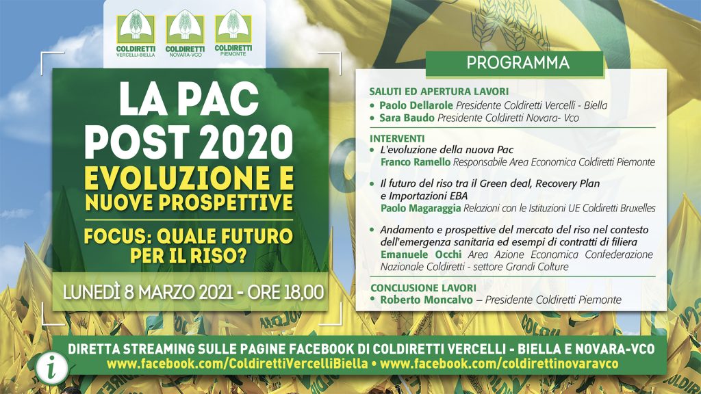 “La Pac post 2020, evoluzione e nuove prospettive – Focus: quale futuro per il riso?” è il titolo dell’incontro online organizzato per lunedì 8 marzo alle 18.00 da Coldiretti Vercelli – Biella e Novara – Vco per fare il punto della situazione e informare su quale sia la direzione e l’impostazione della nuova Politica Agricola Comune Europea.